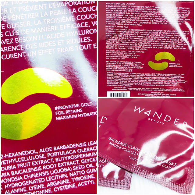 WANDER BEAUTY Baggage Claim are individually packaged gold foiled eye masks that amp up hydration and brightness while lessening problematic dark circles. I haven’t yet tried these ones, since I am waiting for a rainy day to cozy up with a book or my tablet and apply these before bedtime. As soon as I do, I will update my review for you all! For now, let's get into the benefits! The unique gold foil helps retain heat between the mask and skin allowing for maximum absorption of the serum. The long list of beneficial ingredients include the following: